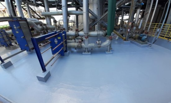 Revestimento aplicado em camadas sucessivas de resina epóxi, de acordo com a especificação de resistência necessária, recebendo uma pintura na cor ...